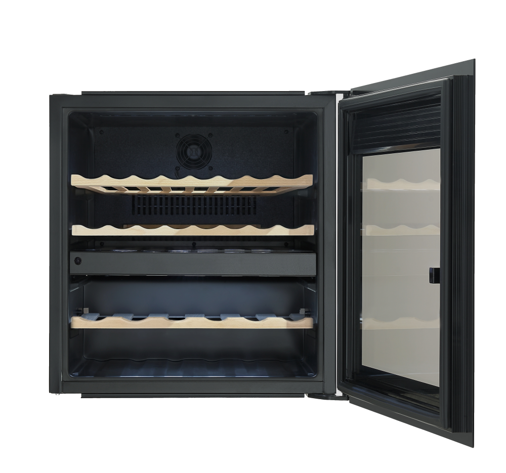 Шкаф отличается компактными габаритами 595×590×563 мм, что позволяет легко интегрировать его в стандартную кухонную мебель. Внутреннее пространство организовано с помощью 4 деревянных полок, обеспечивающих безопасное хранение бутылок. Система циркуляции холодного воздуха поддерживает равномерное распределение температуры по всему объему.