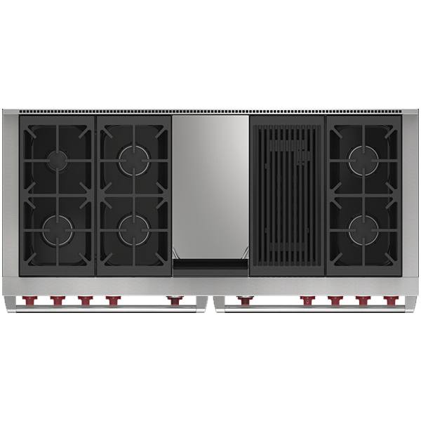 Газовая варочная поверхность состоит из шести горелок, мощностью от 2,7 кВ (для топления) до 5,3 кВ (для быстрого закипания и интенсивной обжарки) . Запатентованная двухуровневая конструкция газовой конфорки Wolf позволяет максимально точно контролировать температуру нагрева. Система искрового реподжига автоматически зажигает горелку при её заливе.
